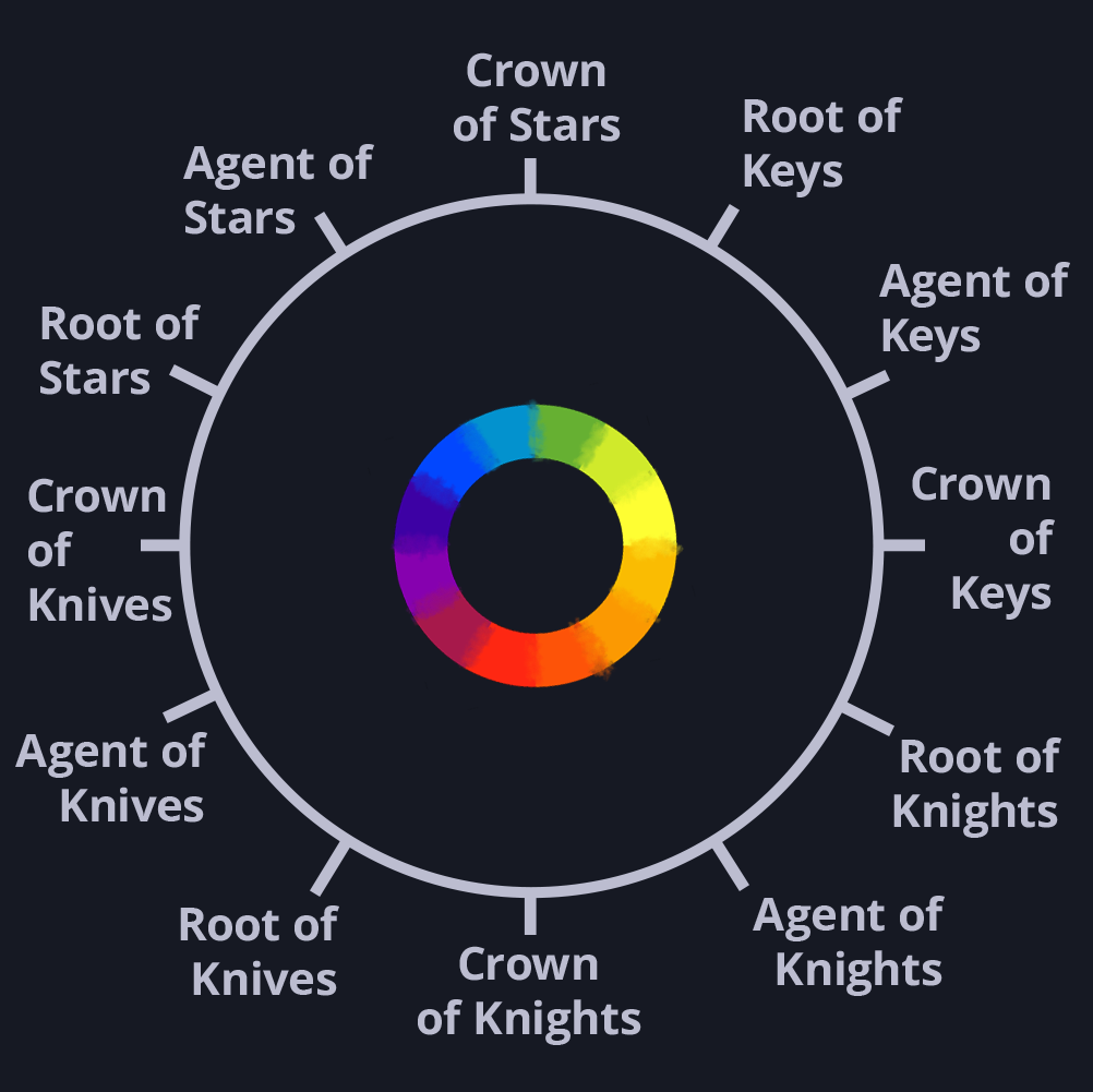 12 archetypes, grouped into 4 suits, each with themes, oppositions, and a role in a larger story cycle, with contrasting elements arranged opposite from one another.