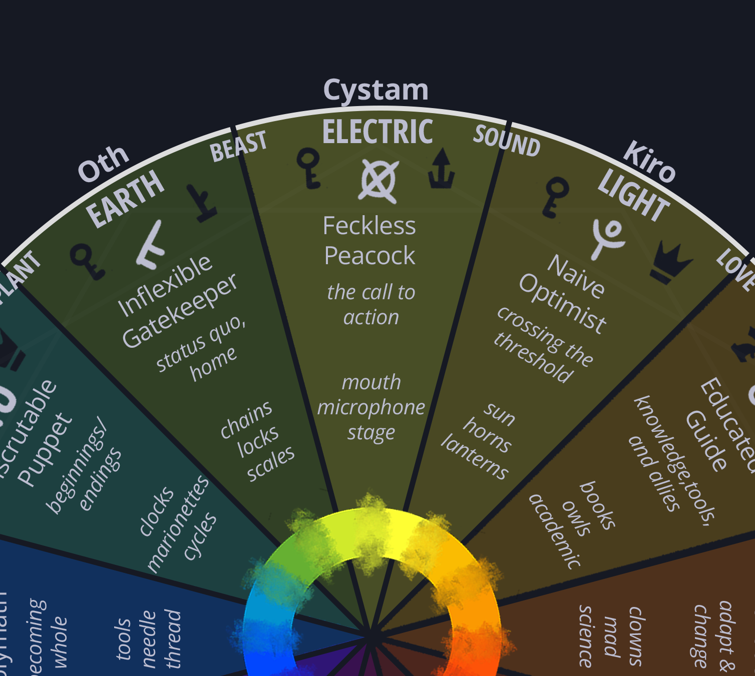 This is where we start to tie our loose, emotional, abstract characters to concrete elemental associations and ideas.