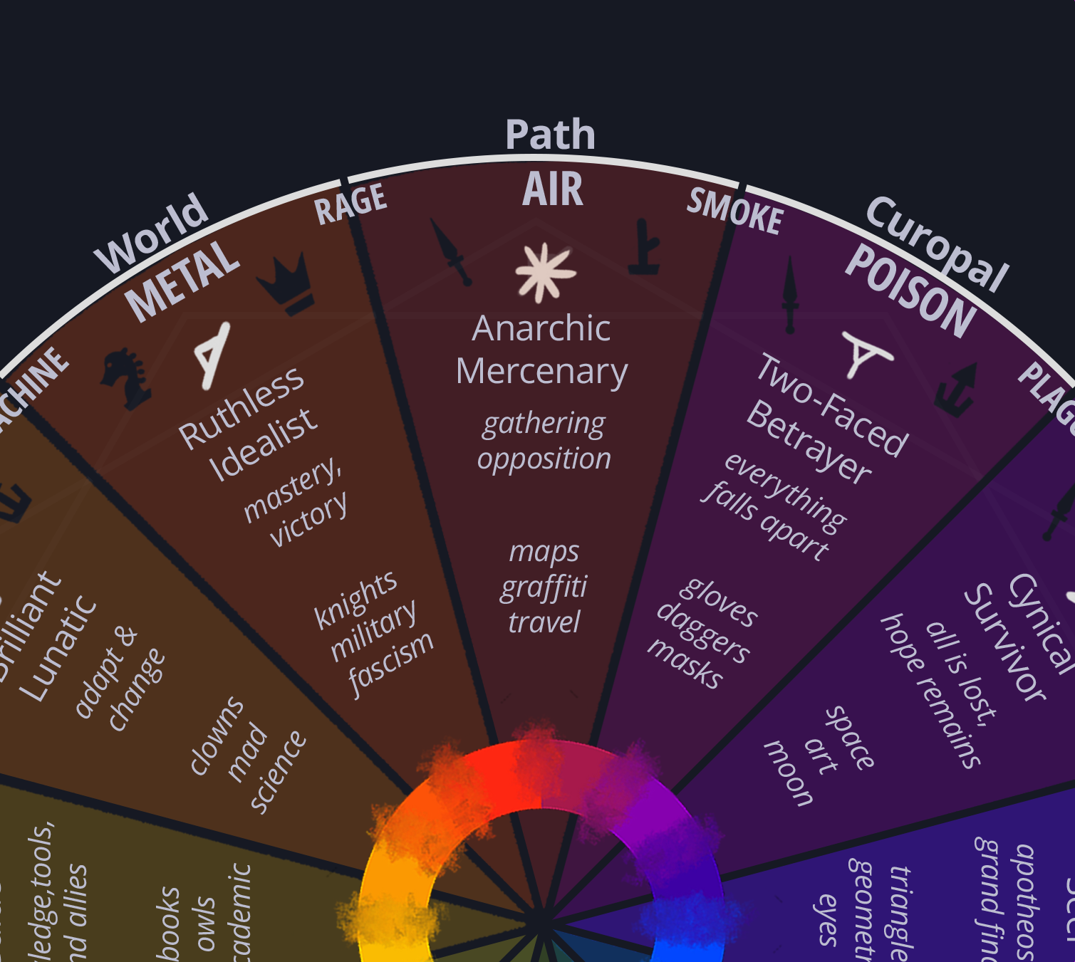 Hopefully the fun part of this book is that we can develop an interesting interplay between the systems at play: the element "void" would associate well with the musical style "dirge", so we pair them up.